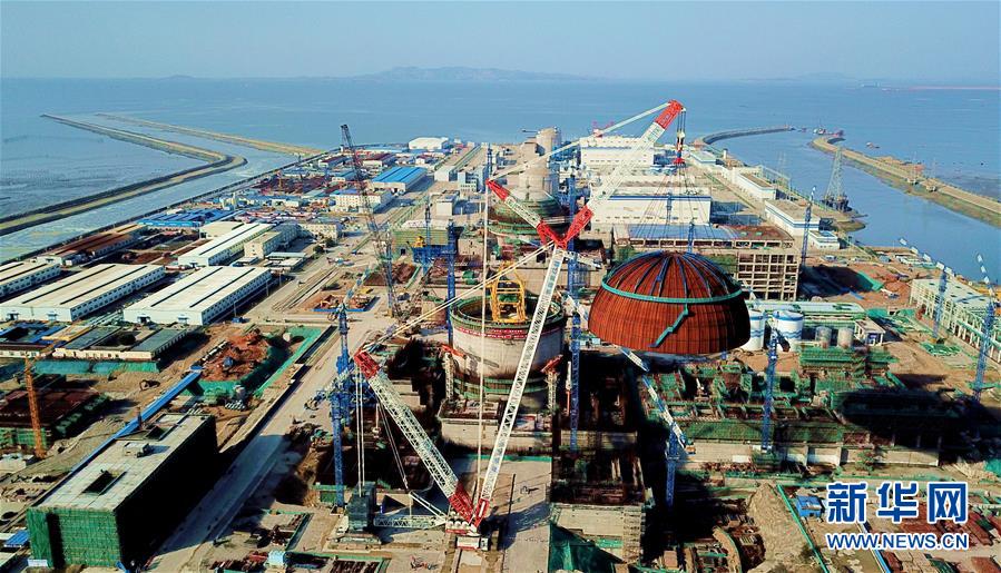 3月21日拍攝的中核集團(tuán)福清核電6號(hào)機(jī)組反應(yīng)堆穹頂?shù)跹b現(xiàn)場(chǎng)(無(wú)人機(jī)拍攝)。