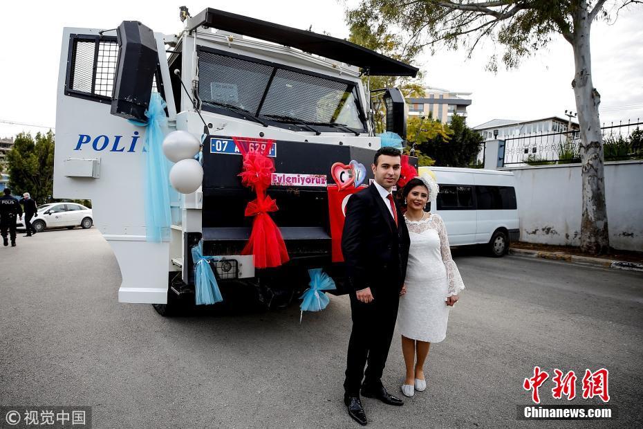 當(dāng)?shù)貢r(shí)間2018年3月21日,土耳其安塔利亞,警官Ceren Ekici和Taha YasinGul舉行婚禮。在10個(gè)月前的一次行動(dòng)中,Taha YasinGul不慎開槍擊中Ceren Ekici的頭部,所幸沒有造成生命危險(xiǎn)。他們的婚禮由警局同事操辦,同事們舉著防彈盾牌,護(hù)送這對(duì)新人走向禮臺(tái)。圖片來源:視覺中國(guó)