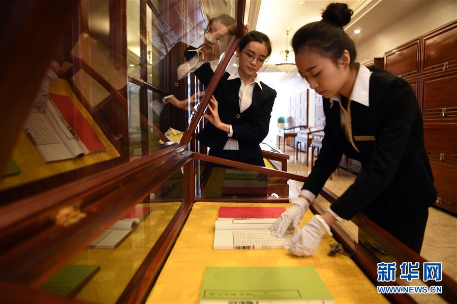 在甘肅天慶博物館,博物館工作人員劉妤(右)整理展柜中的影印本文淵閣《四庫(kù)全書》(4月20日攝)。新華社記者 范培珅攝