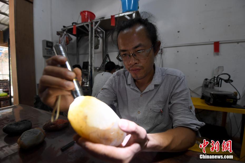 6月20日,廣西南寧市唐人文化街,錢思宇正在審料。1984年的錢思宇出生于湖南懷化,自小喜愛把玩石頭,受父輩影響,從2012年開始從事玉石雕刻工作至今。據(jù)了解,其設計的壯鄉(xiāng)玉雕作品,以人物為主,采用廣西當?shù)靥赜械氖?,結(jié)合壯文化中的銅鼓、壯錦等元素,通過刻畫“壯鄉(xiāng)人”的神態(tài),表達廣西特有的“壯鄉(xiāng)情”。中新社記者 俞靖 攝