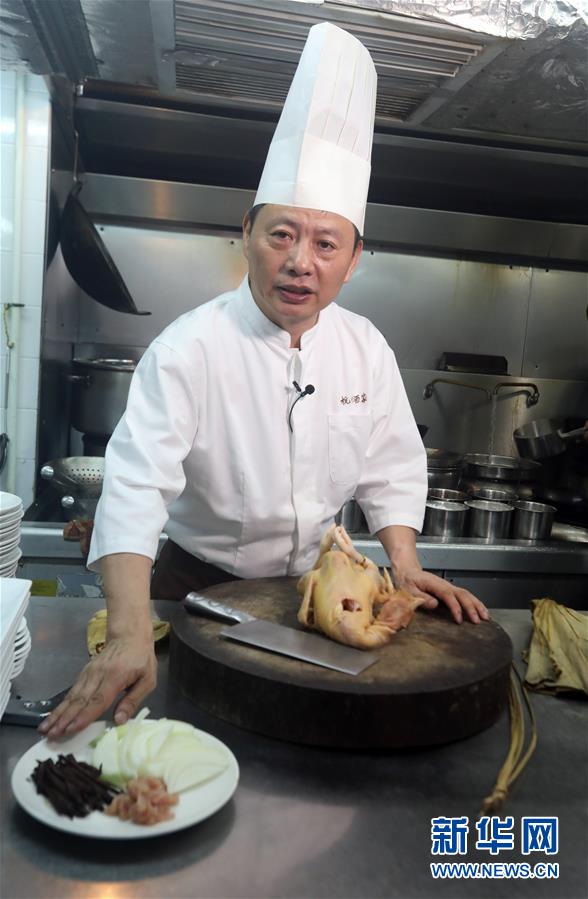 杭州酒家老板吳瑞康向記者介紹“叫化雞”的制作工序(6月16日攝)。 金庸在武俠小說《神雕俠侶》中借郭靖之口說過: “為國為民,俠之大者。”武俠精神在香港備受推崇,有其心向中華文化的情感基礎。在這個國際美食之都,品味舌尖上的武俠味,內(nèi)中的感覺別有深意。新華社記者 李鵬 攝