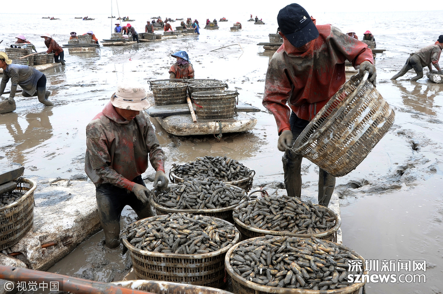 2018年5月30日,漁民們在江蘇連云港沿海地區(qū)海邊的灘涂上將剛收獲的海蟶運(yùn)送上岸裝箱外運(yùn)。