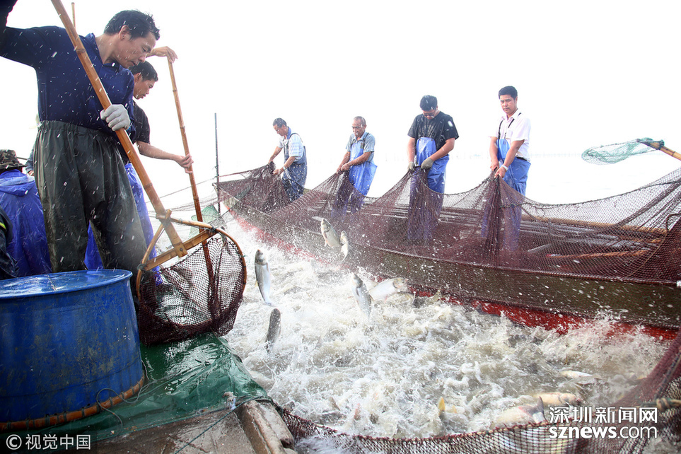 ???? 2018年6月26日,江蘇省常州市嘉澤鎮(zhèn)捕撈村的漁民組織夏季捕撈,一網(wǎng)魚達(dá)五萬余斤,以鰱魚為主,供應(yīng)市場需求。夏捕的魚價較平時有所上漲,漁民粗略估計可增收上萬余元。