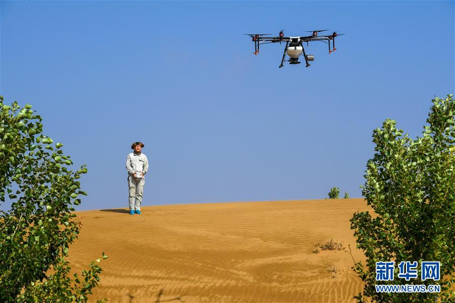 在內(nèi)蒙古鄂爾多斯市杭錦旗的庫布其沙漠中,技術(shù)人員操控?zé)o人機(jī)飛播造林(7月11日攝)。 巍巍陰山南麓,鄂爾多斯高原之北,橫臥著一條長約400公里、寬5-65公里的黃色“長龍”。它似弓弦,將滔滔黃河拉出一個(gè)大大的“幾”字彎。 這是中國第七大、也是距北京最近的沙漠——庫布其沙漠,曾經(jīng)寸草不生,風(fēng)沙肆虐,被稱為“死亡之海”。 幾十年來,庫布其人一代接著一代干,書寫了一部荒漠化治理的英雄史詩。 新華社記者 彭源 攝