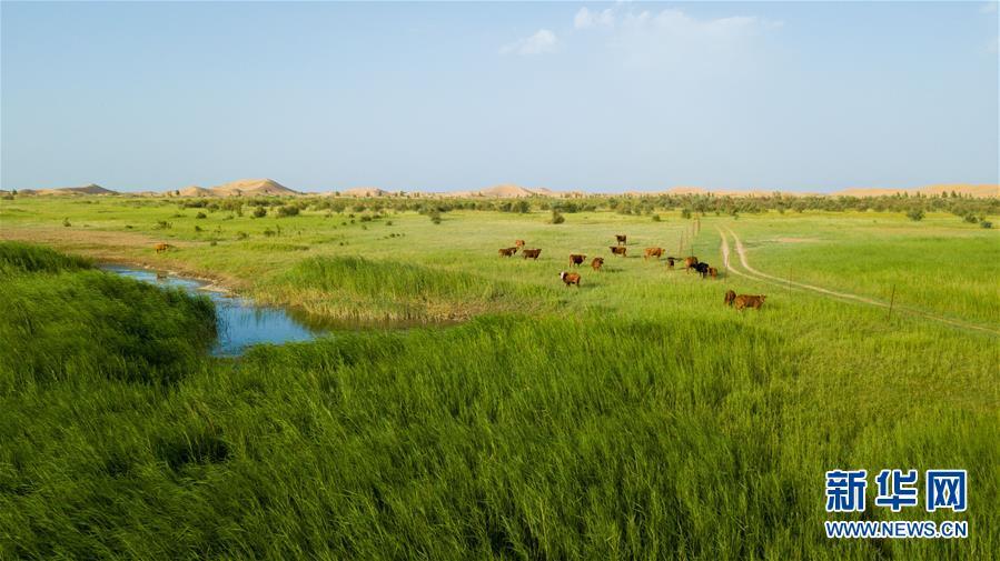 內(nèi)蒙古杭錦旗位于庫(kù)布其沙漠中的生態(tài)修復(fù)景觀(7月11日無人機(jī)拍攝)。 新華社記者彭源攝