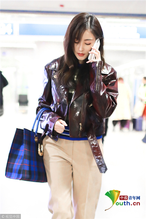 2018年10月25日,北京,張?zhí)鞇?ài)現(xiàn)身機(jī)場(chǎng),她身穿短款漆皮夾克時(shí)尚帥氣,低頭疾走打電話星范十足。