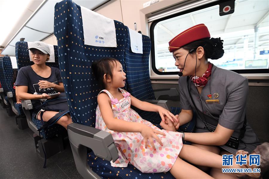 在南寧東站,一名列車工作人員在和一名小朋友交流(2017年8月5日攝)。 廣西壯族自治區(qū)成立60年來(lái),鐵路建設(shè)發(fā)生翻天覆地的變化。來(lái)自中國(guó)鐵路南寧局集團(tuán)有限公司的數(shù)據(jù)顯示,1958年廣西鐵路總里程為1346.3公里,如今廣西鐵路總里程達(dá)5191公里。廣西與周邊相鄰省份間實(shí)現(xiàn)動(dòng)車“公交化”開(kāi)行。此外,北部灣港—重慶班列、東盟海產(chǎn)品冷鏈班列、“百色一號(hào)”果蔬專列等的開(kāi)通和運(yùn)營(yíng),強(qiáng)化了鐵路供給的針對(duì)性和有效性。鐵路成為助推廣西經(jīng)濟(jì)社會(huì)快速發(fā)展的“大動(dòng)脈”。 新華社記者陸波岸攝