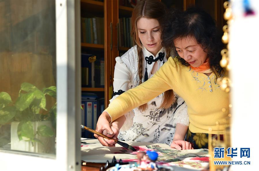 11月24日,在石家莊橋西區(qū)家中,艾米莉跟婆婆學習畫中國畫。 新華社發(fā)(張曉峰 攝)