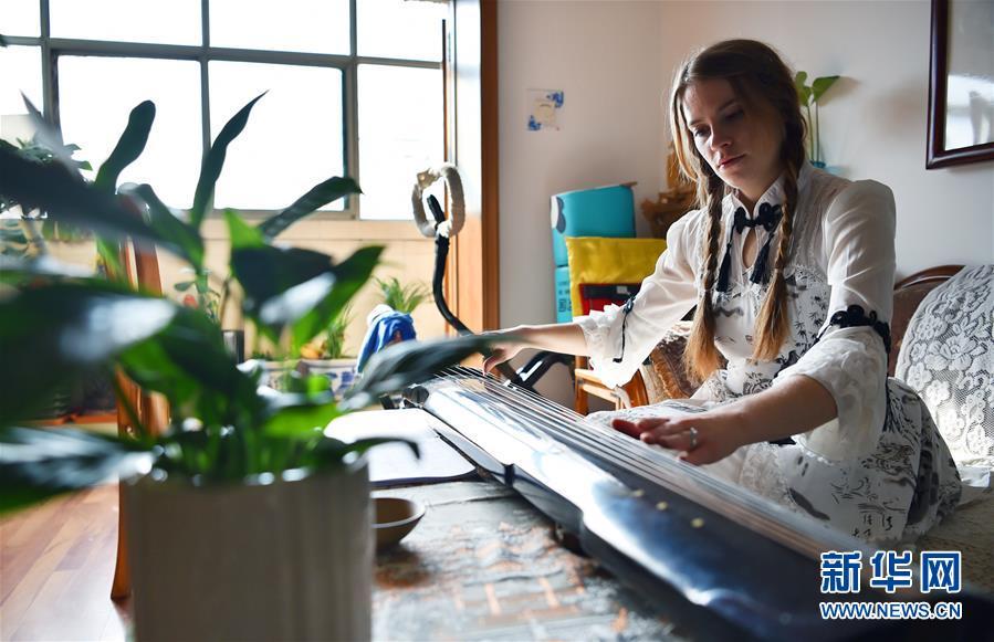 11月24日,在石家莊橋西區(qū)家中,艾米莉在練習彈古琴。 新華社發(fā)(張曉峰 攝)