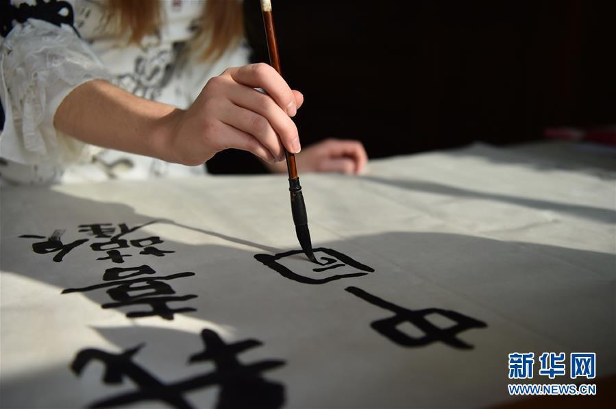 11月24日,在石家莊橋西區(qū)家中,艾米莉在練習書法。 新華社發(fā)(張曉峰 攝)