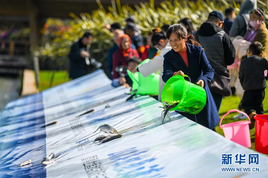11月23日,市民在活動現場投放魚苗。 新華社記者江文耀攝