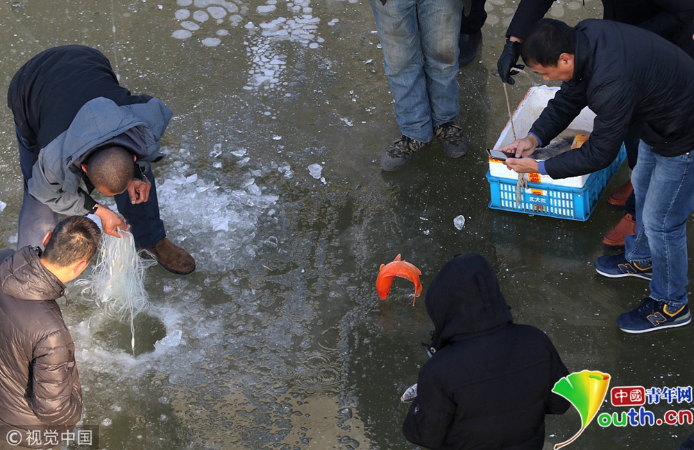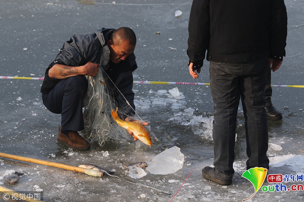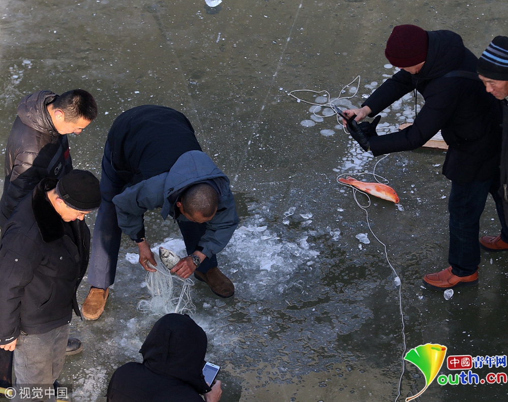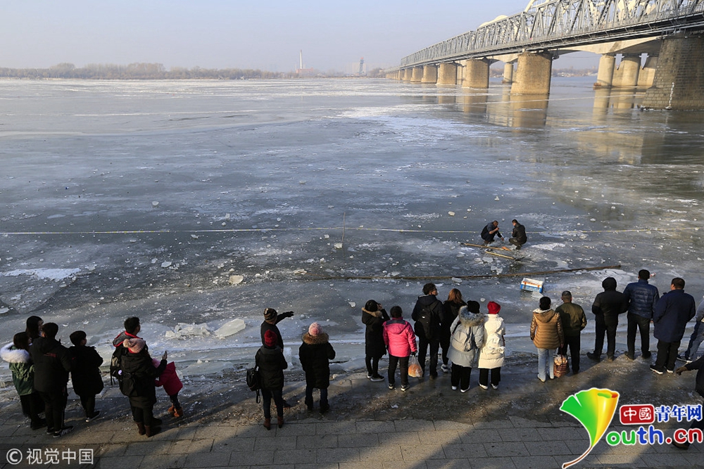 2018年11月25日,黑龍江省哈爾濱市,松花江封江不久,已經有人蹬江鑿冰下網捕魚。 圖片來源:視覺中國