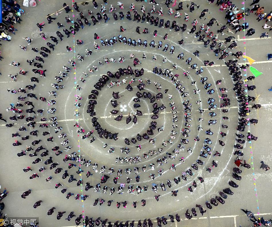 11月20日報道,2018年11月19日,侗族同胞在參加貴州省從江縣慶云鎮(zhèn)“凍魚節(jié)”踩歌堂。(無人機拍攝)2018年11月19日,貴州省從江縣慶云鎮(zhèn)境內的石姓侗族同胞迎來傳統(tǒng)一年一度的“凍魚節(jié)”,當?shù)囟弊逋碇?jié)日盛裝舉行祭薩、踩歌堂、賽侗歌,慶祝豐收,祈福來年風調雨順,五谷豐登。