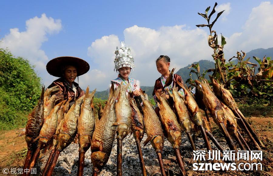 廣西柳州市融水縣山區(qū)有插秧時節(jié)放養(yǎng)鯉魚苗的習俗,金秋時節(jié)稻熟魚肥,收稻燒魚成為別致一景。