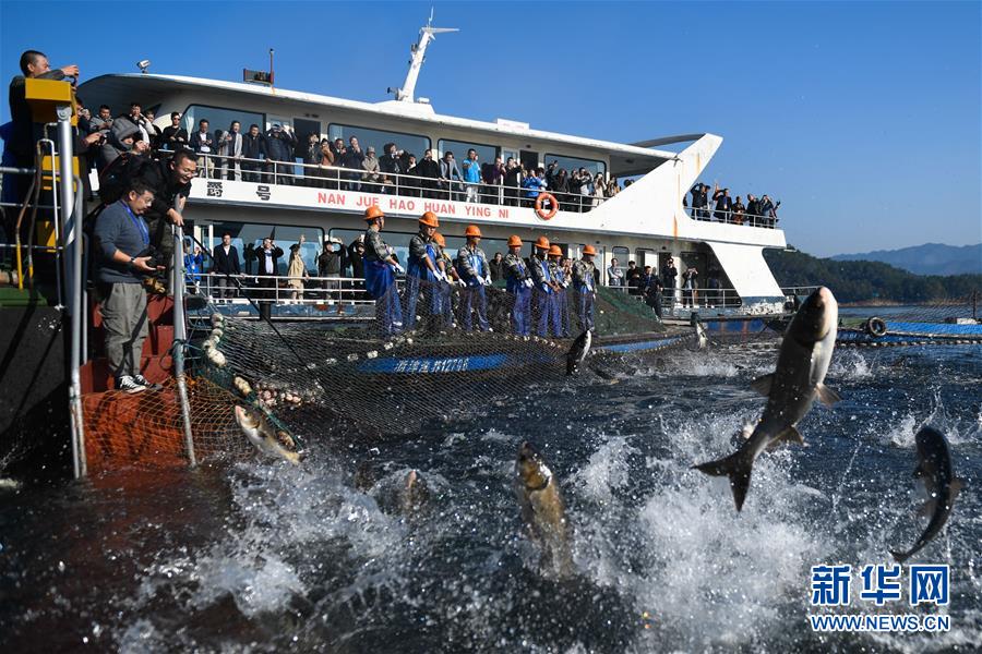 當日,浙江省杭州市淳安縣千島湖中心湖區(qū)上演巨網捕魚,30余名捕撈隊員經過半個多小時拉網,獲得大豐收。