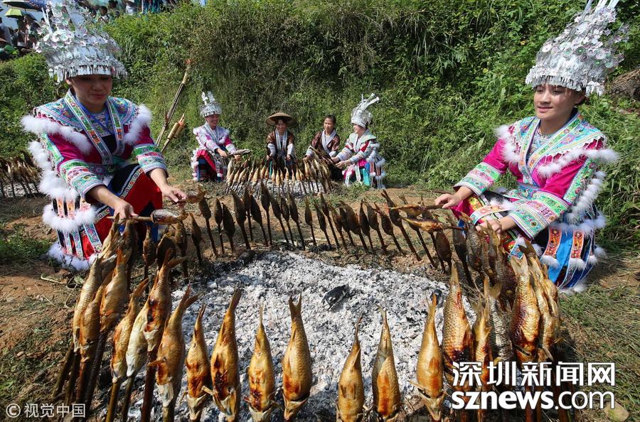 深圳新聞網訊 2018年9月15日,廣西柳州市融水苗族自治縣喜迎中國首屆“農民豐收節(jié)”——2018金秋燒魚季啟動儀式在桿洞鄉(xiāng)花孖苗寨舉行,數(shù)百名苗族群眾和游人共同開展了水田拔河、田間捉魚、傳統(tǒng)打谷和燒魚等活動,慶祝豐收。