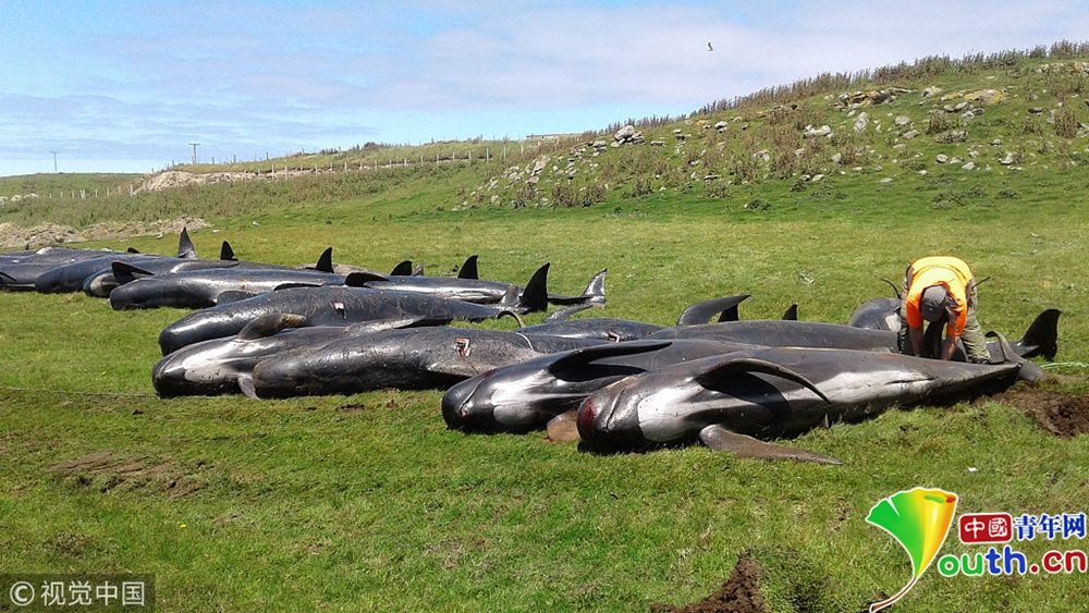 當(dāng)?shù)貢r間11月30日,新西蘭查塔姆島,多頭巨頭鯨在當(dāng)?shù)睾R淺死亡,尸體被沖上岸。