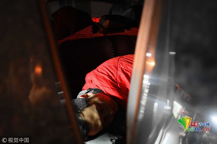 2018年11月17日,北京,由于醫(yī)院只允許一名家長(zhǎng)陪護(hù),醫(yī)院門(mén)口的日租房又很貴,袁東方不舍得花錢,只好借住在病友的車內(nèi)。魏建順/視覺(jué)中國(guó)