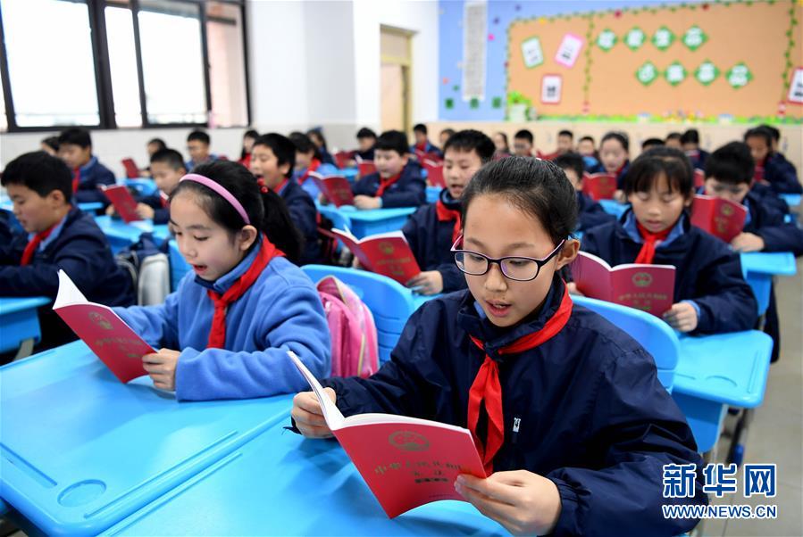 12月3日,合肥市朝霞小學(xué)的學(xué)生們在誦讀憲法。國家憲法日到來之際,各地學(xué)校紛紛舉辦主題宣講活動,對學(xué)生開展法治教育,幫助孩子們了解憲法知識。新華社記者 劉軍喜 攝