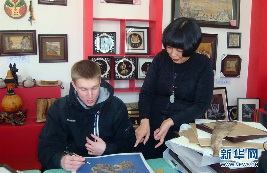 張琳在位于哈爾濱的工作室指導(dǎo)前來(lái)參觀學(xué)習(xí)的外國(guó)學(xué)生制作魚皮畫(2011年3月20日攝)。國(guó)家級(jí)非物質(zhì)文化遺產(chǎn)赫哲族魚皮制作技藝是我國(guó)赫哲族傳統(tǒng)手工藝術(shù)。作為這項(xiàng)技藝的黑龍江省級(jí)傳承人,十余年來(lái),張琳一直從事魚皮畫的研究和創(chuàng)作,并通過(guò)做推廣、開講座、辦活動(dòng),讓更多年輕人了解并喜歡上這一傳統(tǒng)手工藝,將這項(xiàng)瀕臨失傳的藝術(shù)更好地傳承下去。新華社發(fā)