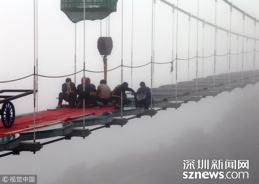 深圳新聞網(wǎng)訊 2018年12月3日,在浙江玉環(huán)市上棧頭玻璃吊橋建設(shè)工地上,工人們正在北端橋頭鋪設(shè)橋面4厘米厚的玻璃,預(yù)計46個箱梁的玻璃全部鋪設(shè)完成需到5日,然后再進(jìn)入安裝兩側(cè)護欄和拉攀抗風(fēng)拉索,吊橋工程竣工定于23日,準(zhǔn)備在2019年元旦試運行。