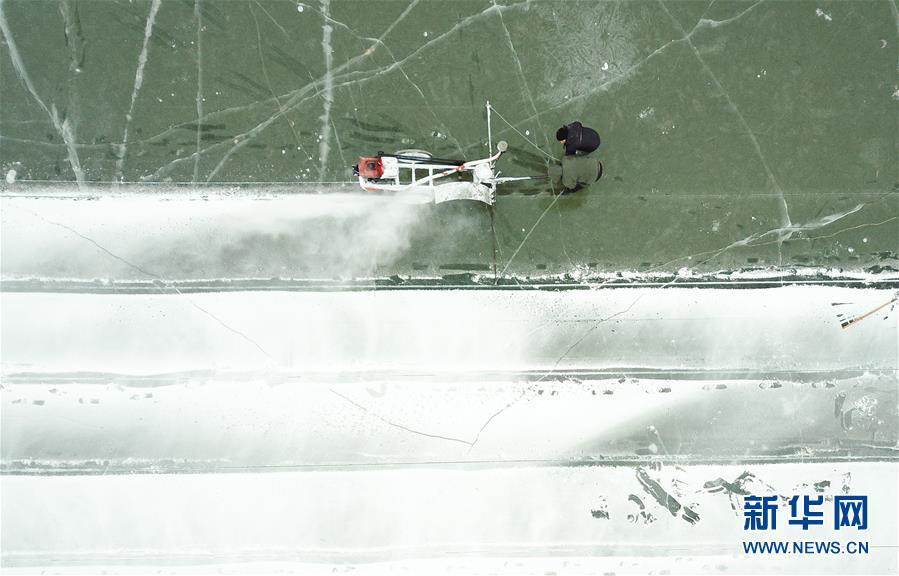 在松花江哈爾濱段江面,工人們在進(jìn)行切割和采冰工作(12月12日無人機(jī)拍攝)。 黑龍江哈爾濱市的冰雪主題樂園哈爾濱冰雪大世界的采冰和建設(shè)工作近日拉開帷幕。為保證足夠的優(yōu)質(zhì)冰供給,每天有近千名采冰人和700多輛運(yùn)冰車參與到采冰工作。 新華社記者 王松 攝