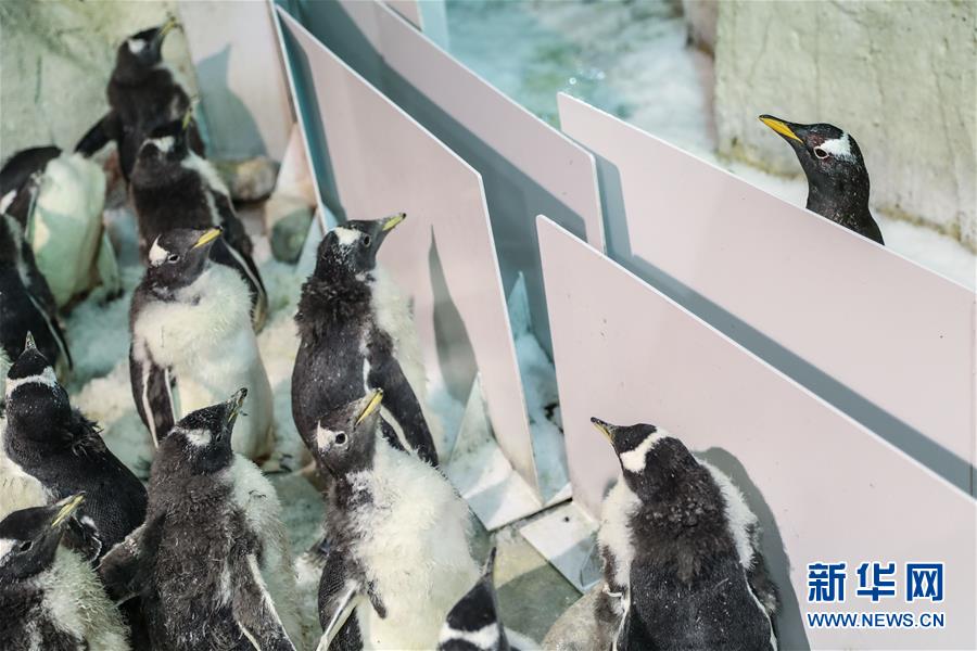 1月9日,成年白眉企鵝(右)在隔離板外關(guān)注自己的寶寶。 新華社記者 潘昱龍 攝