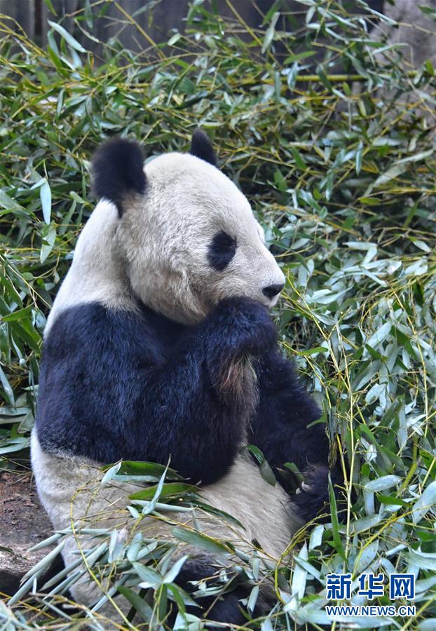 1月13日,大熊貓?jiān)诒本﹦?dòng)物園恒溫的熊貓館內(nèi)吃竹子。 新華社記者 李欣 攝