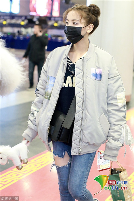 2019年1月14日,北京,楊超越現(xiàn)身機場。她扎哪吒頭活力十足,甩玩偶淘氣回眸,穿破洞褲露美腿,披面包服似自帶鼓風(fēng)機。