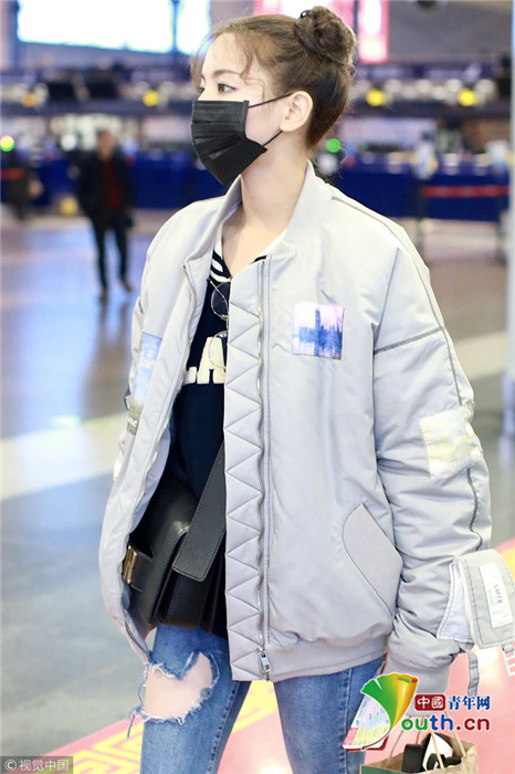 2019年1月14日,北京,楊超越現(xiàn)身機場。她扎哪吒頭活力十足,甩玩偶淘氣回眸,穿破洞褲露美腿,披面包服似自帶鼓風機。