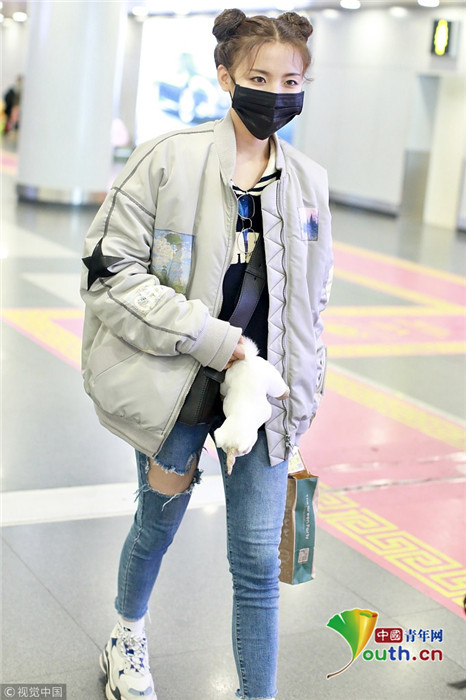 2019年1月14日,北京,楊超越現身機場。她扎哪吒頭活力十足,甩玩偶淘氣回眸,穿破洞褲露美腿,披面包服似自帶鼓風機。