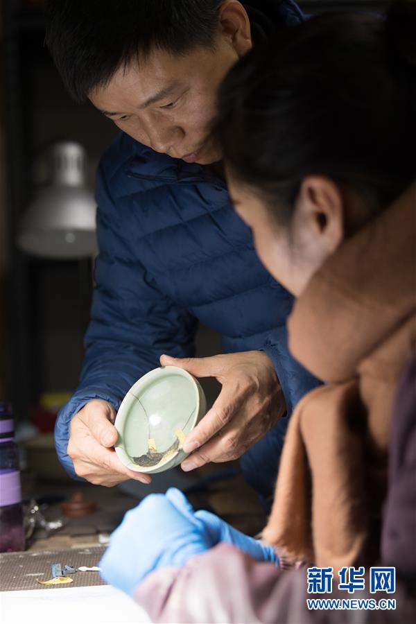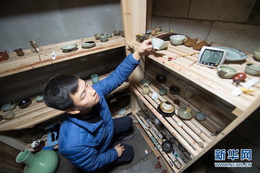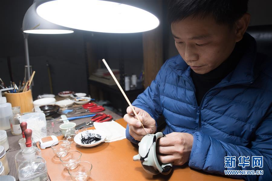 1月15日,吳榮強在龍泉市牛頭嶺村“七分醉”工作室對一件青瓷器皿進行漆繕。 新華社記者翁忻旸攝