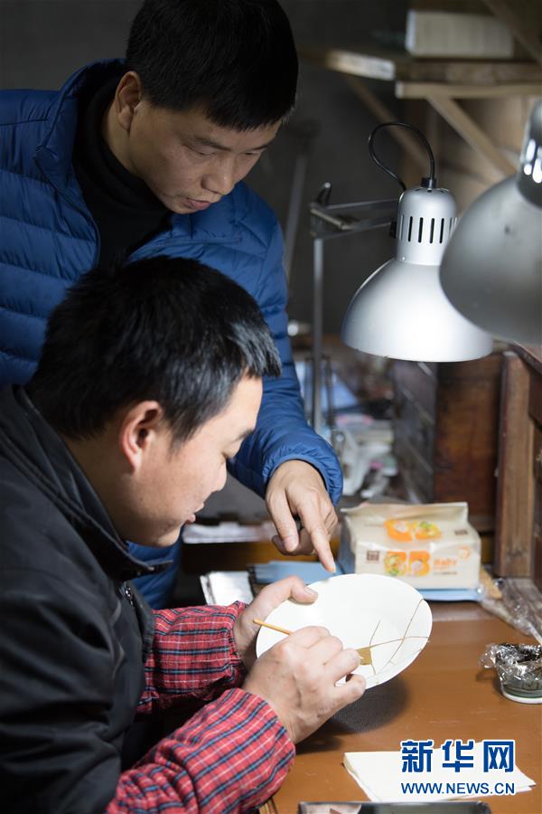 1月15日,在龍泉市牛頭嶺村“七分醉”工作室,吳榮強(左)指導一名徒弟進行漆繕。 新華社記者翁忻旸攝