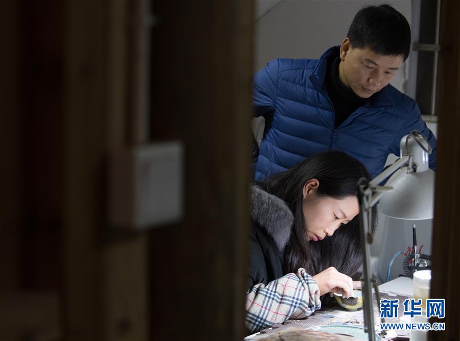 1月15日,在龍泉市牛頭嶺村“七分醉”工作室,吳榮強(上)指導一名徒弟進行漆繕。 新華社記者翁忻旸攝