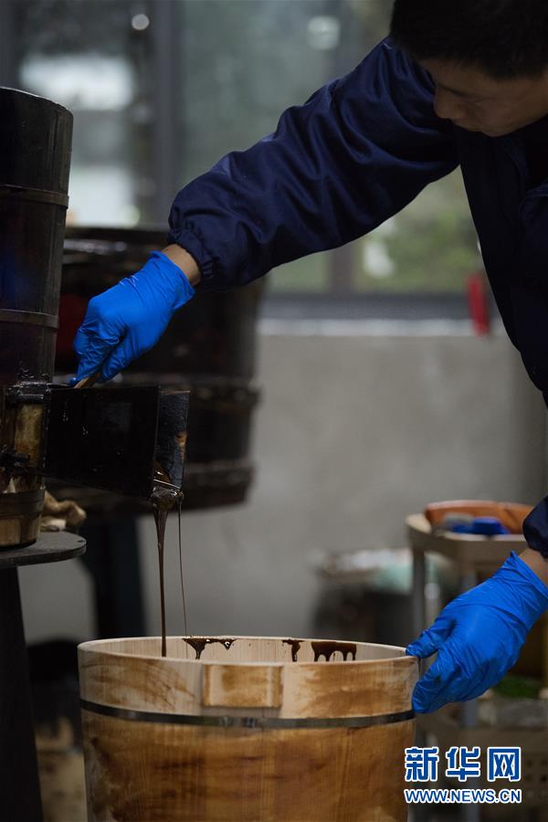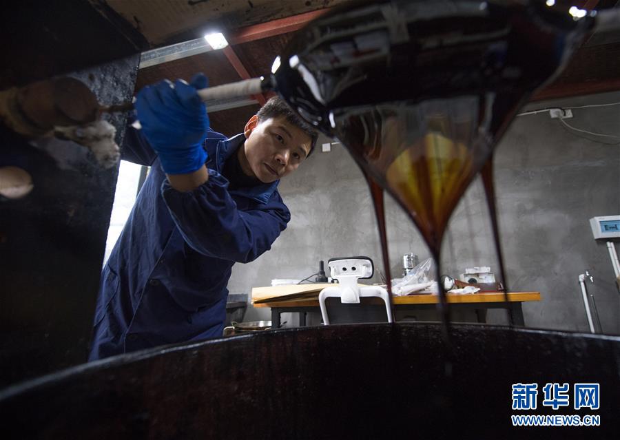 1月15日,吳榮強在龍泉市牛頭嶺村“七分醉”工作室濾漆。 新華社記者翁忻旸攝