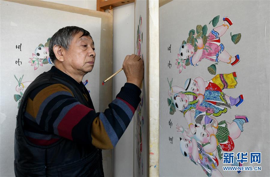 1月16日,霍慶順在彩繪年畫《五子奪蓮》。