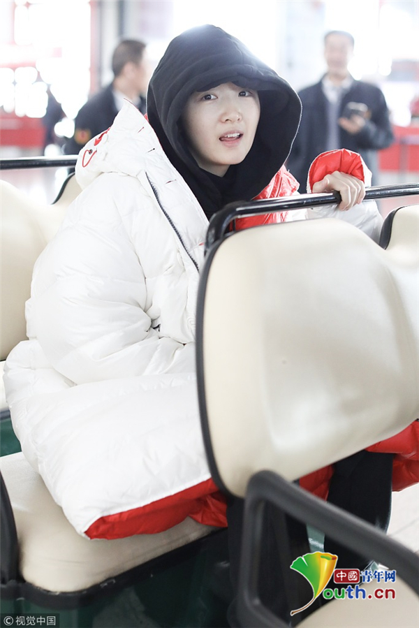 周冬雨連衣帽罩頭襯托小臉 下巴擱在行李車推桿呆萌可愛(ài)