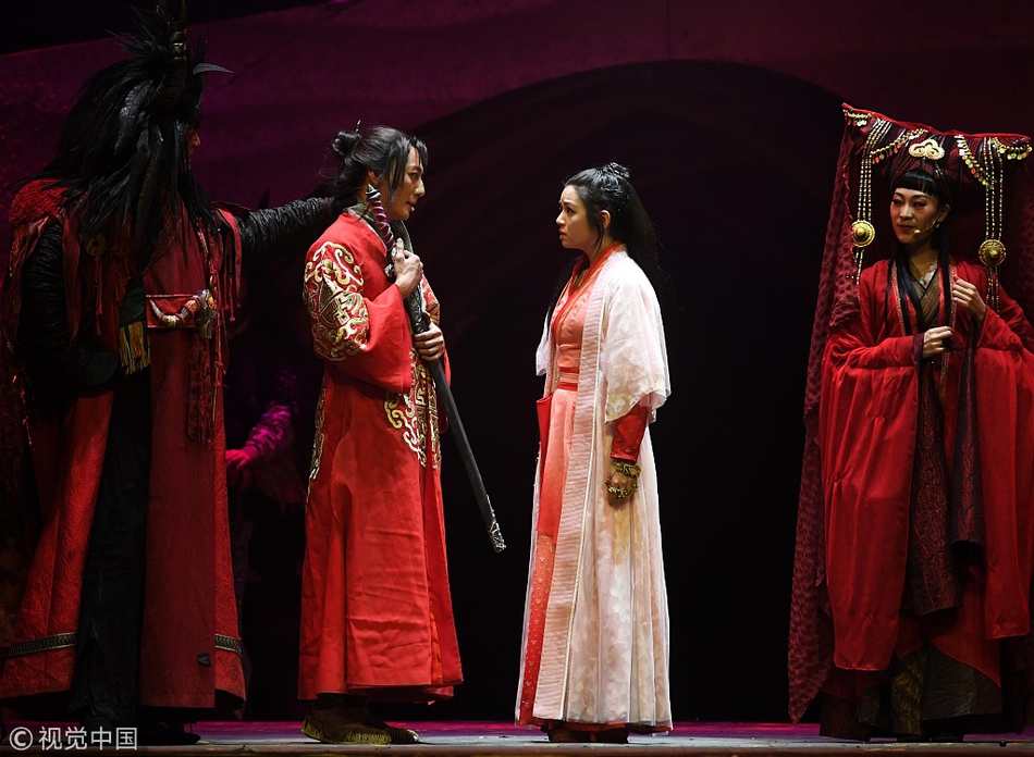 日前,舞臺(tái)劇《大話西游之大圣娶親》在梅蘭芳大劇院首次公開演出。陳妍希飾演“紫霞仙子”靈氣十足。視覺中國(guó)/圖