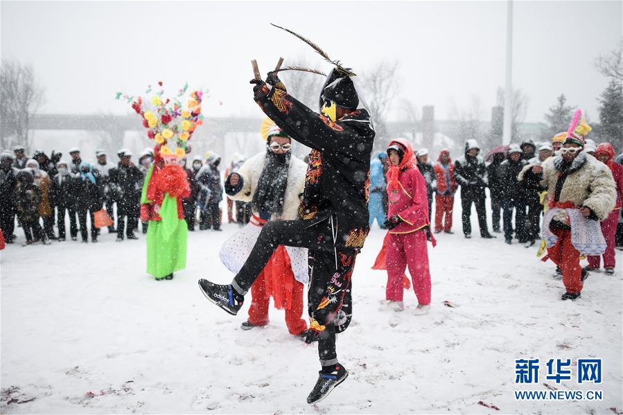 2月16日,群眾在青海省大通回族土族自治縣文化廣場冒雪觀看社火表演。新華社記者吳剛攝