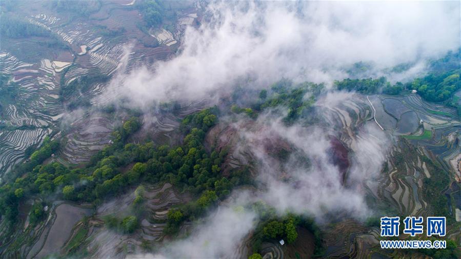 這是在云南省元陽縣拍攝的傍晚時分的哈尼梯田美景(4月3日無人機拍攝)。哈尼梯田位于云南省哀牢山南部,以哈尼族為主的當地群眾千百年來生生不息在大地上“雕刻”出這一農耕文明奇觀。春日里,漫山的水稻梯田與云海、森林、村莊形成一幅美麗的畫卷,吸引眾多海內外游客前來觀賞。新華社記者 胡超 攝