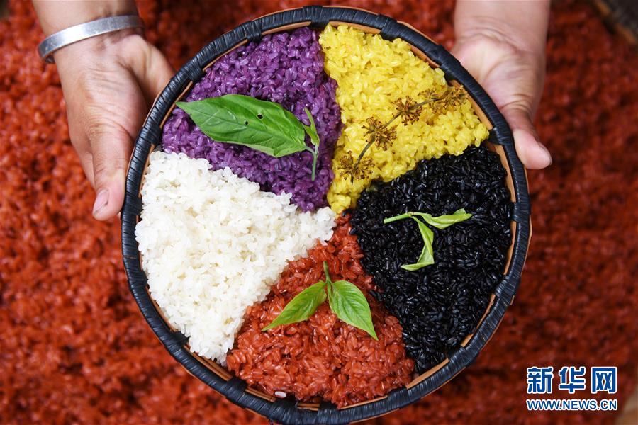 每年農(nóng)歷三月十五前后,貴州省黔東南苗族侗族自治州臺(tái)江縣苗族同胞有制作“姊妹飯”、喜迎姊妹節(jié)的習(xí)俗?!版⒚蔑垺笔鞘褂貌煌参锏臉?shù)葉或花朵碾壓成汁液作為原色,對(duì)糯米進(jìn)行浸泡并蒸熟的五彩糯米飯。姊妹節(jié)期間,青年男子可以向心儀的姑娘討要“姊妹飯”,姑娘們則通過(guò)贈(zèng)送藏有不同物品的“姊妹飯”傳情達(dá)意。