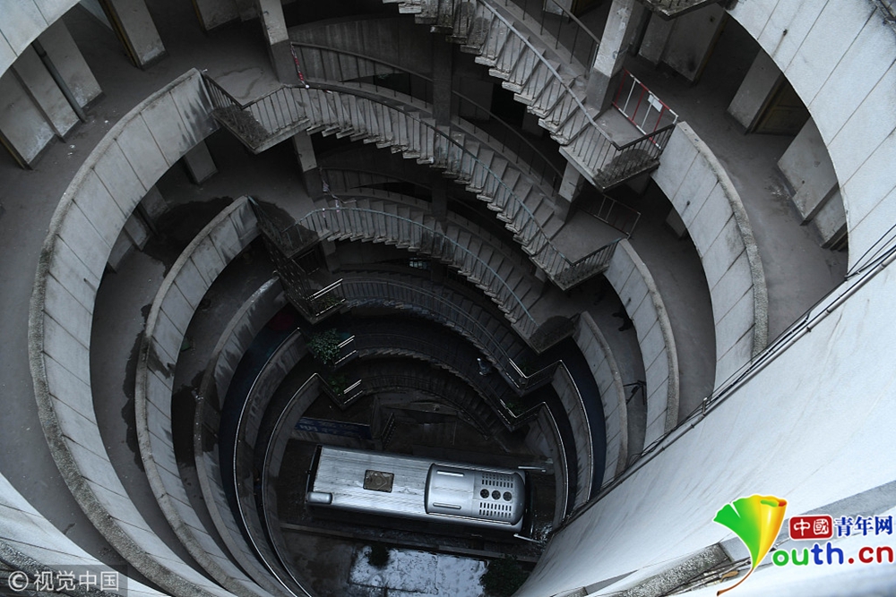 2018年12月6日,重慶江北紅旗河溝汽車站內(nèi),有一棟獨特的八層圓環(huán)狀建筑,底層每天有不少進(jìn)出站的客車通行。圖為公交車穿過8層空心圓筒樓。