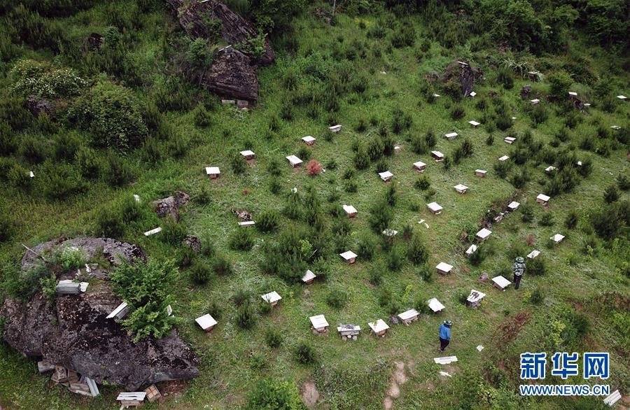 5月10日,在甘肅省隴南市徽縣大河店鎮(zhèn)硬灣村,蜂農(nóng)查看蜂箱情況(無人機拍攝)。 甘肅省隴南市徽縣大河店鎮(zhèn)硬灣村位于秦巴山區(qū)深處,2017年,在當(dāng)?shù)卣姆龀窒?,龍崖老巢蜜養(yǎng)殖農(nóng)民專業(yè)合作社成立,蜂農(nóng)們將傳統(tǒng)養(yǎng)蜂技藝和現(xiàn)代加工方式相結(jié)合,并通過電商等渠道打開銷路,有效帶動了當(dāng)?shù)刎毨Т迕衩撠氈赂弧D壳罢麄€合作社共有蜂箱2000余個,每箱每年可帶來三四千元的收入。 新華社記者 馬寧 攝