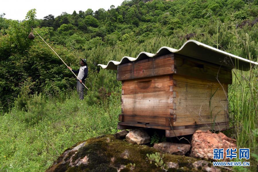 5月10日,在甘肅省隴南市徽縣大河店鎮(zhèn)硬灣村,蜂農(nóng)周仲頤在收蜂。 甘肅省隴南市徽縣大河店鎮(zhèn)硬灣村位于秦巴山區(qū)深處,2017年,在當(dāng)?shù)卣姆龀窒?,龍崖老巢蜜養(yǎng)殖農(nóng)民專(zhuān)業(yè)合作社成立,蜂農(nóng)們將傳統(tǒng)養(yǎng)蜂技藝和現(xiàn)代加工方式相結(jié)合,并通過(guò)電商等渠道打開(kāi)銷(xiāo)路,有效帶動(dòng)了當(dāng)?shù)刎毨Т迕衩撠氈赂弧D壳罢麄€(gè)合作社共有蜂箱2000余個(gè),每箱每年可帶來(lái)三四千元的收入。 新華社記者 馬寧 攝