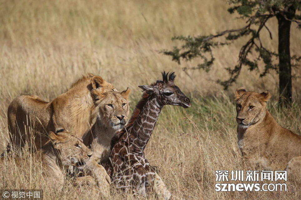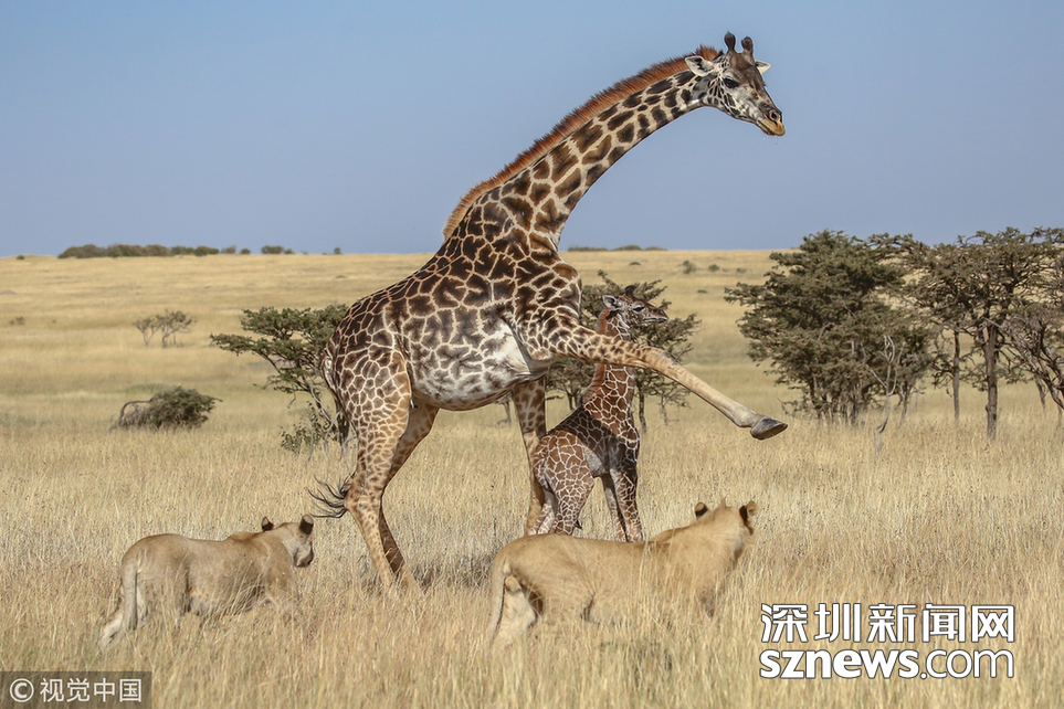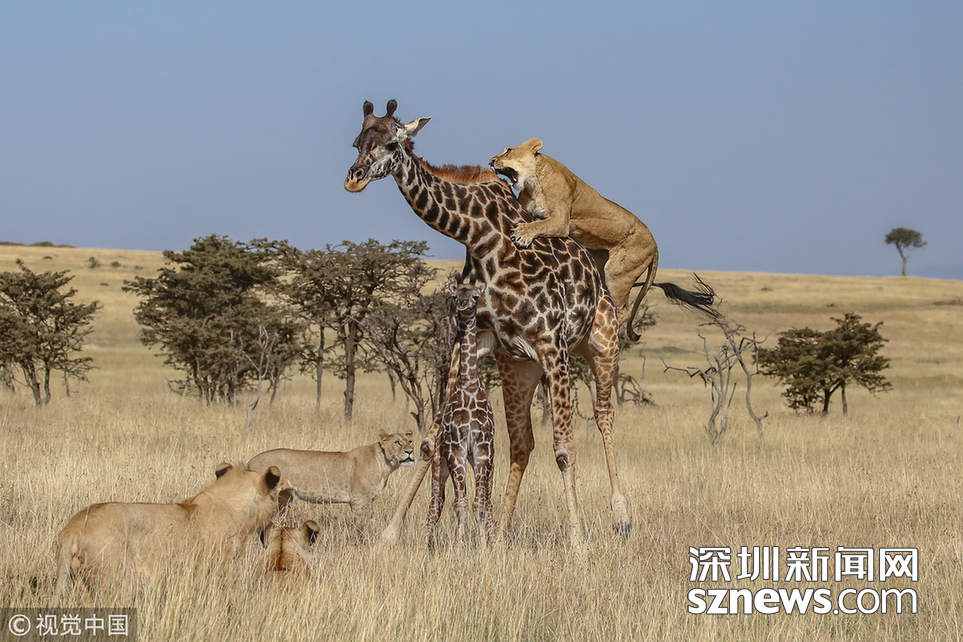 深圳新聞網訊 當?shù)貢r間2018年8月15日,肯尼亞馬賽馬拉,當?shù)貙в握材匪埂ぜ{帕索(James Nampaso)拍攝到一群獅子圍攻母長頸鹿和她的幼崽。盡管長頸鹿勇敢地抵抗獅群的進攻,但當一頭母獅跳上它的脊背時,它被分散了注意力,使得獅群最終捕獲了它的孩子。