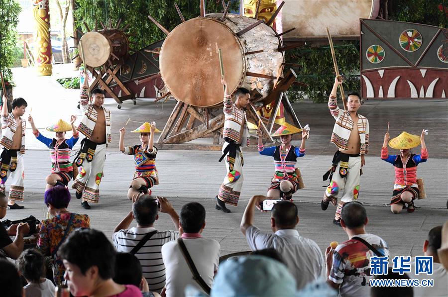 游客在觀賞基諾族大鼓舞表演(6月1日攝)。 在云南省西雙版納傣族自治州景洪市基諾山基諾族鄉(xiāng)的基諾族村寨,每天的基諾大鼓舞表演吸引了眾多游客前來觀賞體驗(yàn),帶動(dòng)了基諾族群眾就業(yè)和增收?;Z族大鼓舞蘊(yùn)涵豐富的歷史文化內(nèi)涵,已被列入國(guó)家級(jí)非物質(zhì)文化遺產(chǎn)保護(hù)名錄。 新華社記者 楊宗友 攝