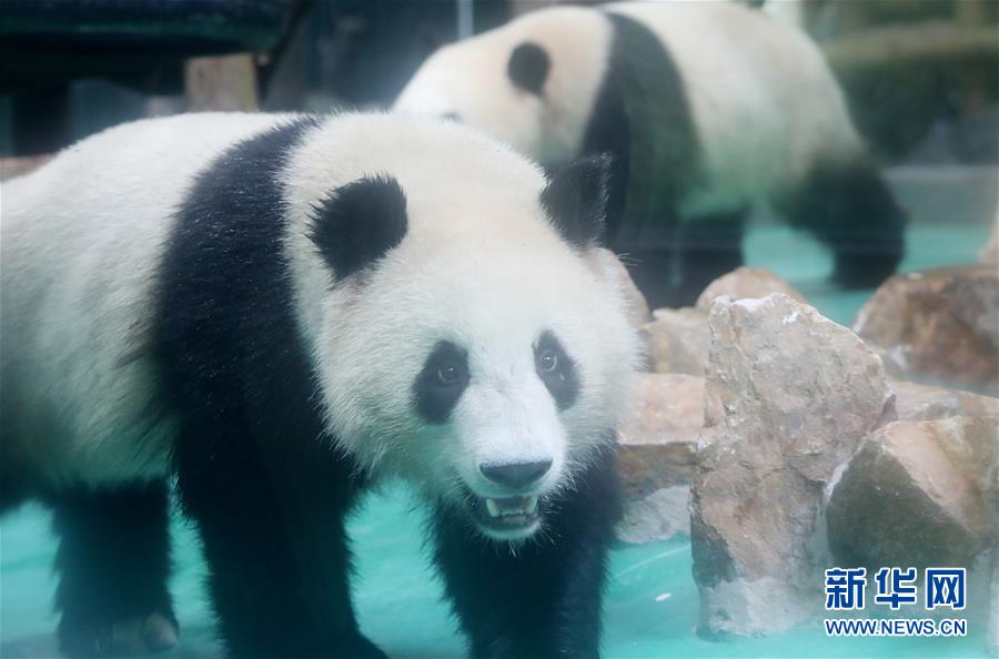 6月18日,大熊貓“和風”(前)透過玻璃幕墻向外張望。 當日,來自四川的大熊貓兄弟“和風”與“星光”飛抵上海,正式開始了在上海動物園為期三年的生活。為迎接這對“風光兄弟”,上海動物園將原有的大熊貓館擴建并裝修一新,空調(diào)、水池、游樂場以及竹葉儲存間等配置齊全。 新華社記者 方喆 攝