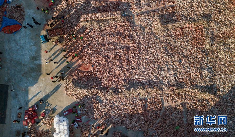 12月27日,在吉林松原查干湖漁場(chǎng),工人們將魚裝箱(無(wú)人機(jī)拍攝)。新華社記者張楠攝