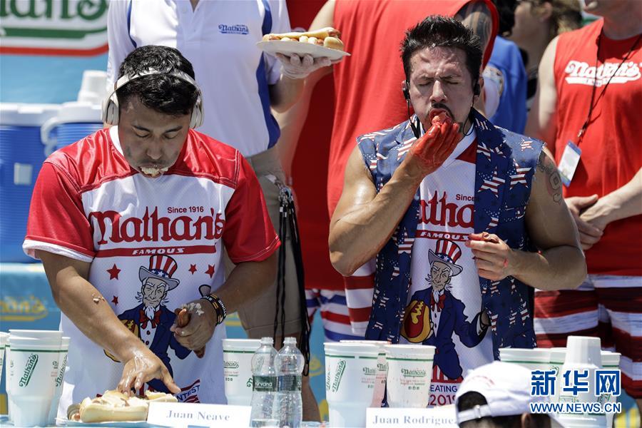 7月4日,在美國紐約康尼島,喬伊·切斯特納特(前)慶祝吃熱狗大賽奪冠。 新華社記者 李木子 攝