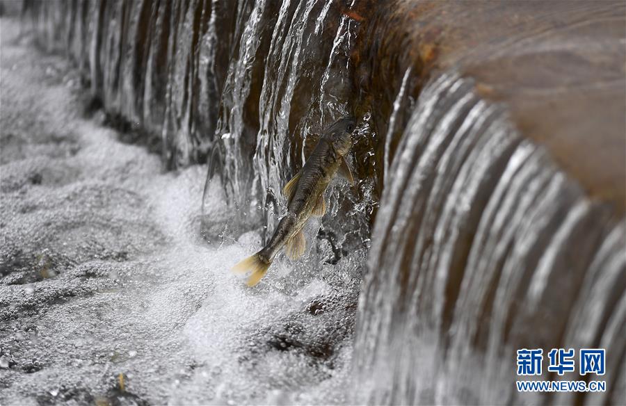 7月6日,在青海省剛察縣沙柳河里,一只湟魚向上洄游。 新華社記者 吳剛攝
